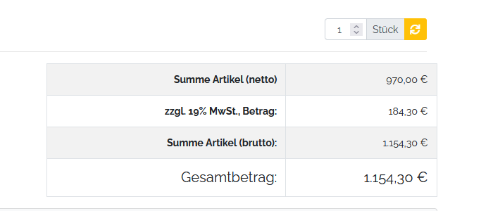 Diese Bruttopreis wird im Frontend dann auch angezeigt und im Warenkorb von diesem Bruttopreis dann die 19% MwSt. abgezogen, so das der Nettopeis für den Kunden effektiv 970 Euro beträgt…