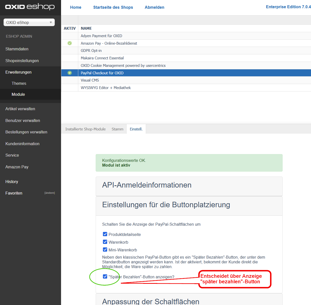 Wie gesagt, der Grund das Du den Button noch siehst, ist die fehlende Freischaltung von “Kreditkarte”. Wie man auf Deinem Screenshot sieht, hast Du eigentlich gar keine Freischaltung für eine der weiteren Zahlarten erhalten.