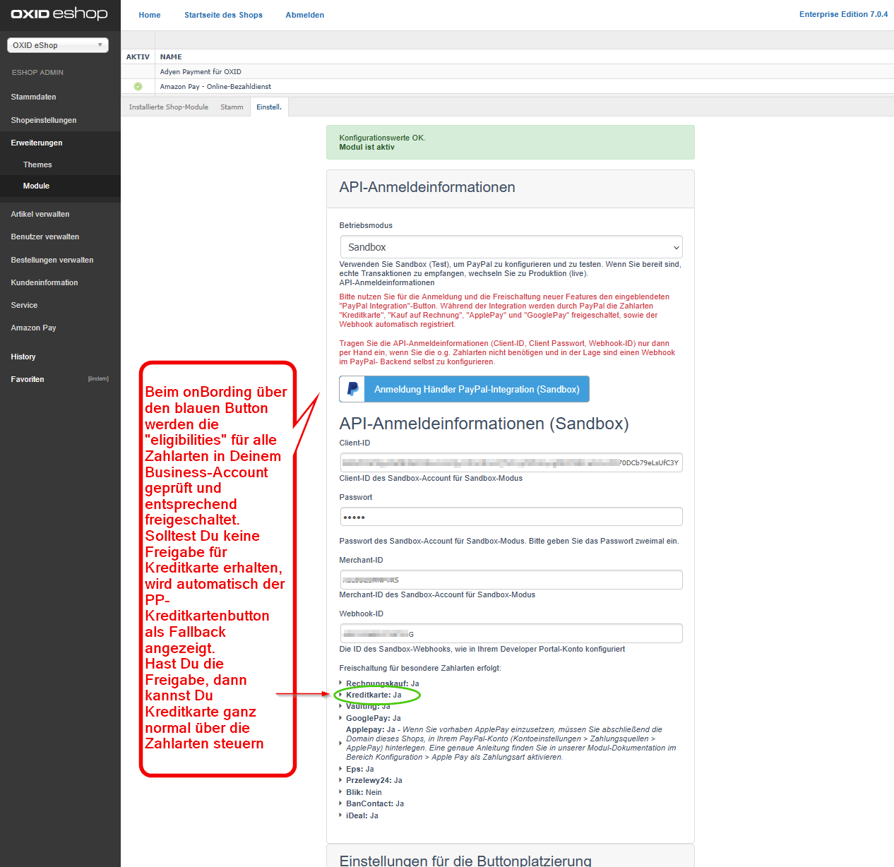 Funktioniert der Weg über die Sandbox nicht, dann kann man in Deinem System ggf. prüfen (debuggen), warum die Abfrage der Eligibilities oder die Speicherung der Eligibilities nach der Abfrage in den Moduleinstellungen nicht erfolgreich war.