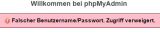 Danach habe ich über den Browser phpmyAdmin ansteuern wollen (URL/phpAdmin //gemäß meiner Ordnerstruktur). Es kam auch der Aufruf zur Kennworteingabe. Nur dann kommt immer folgende Fehlermeldung, obwohl die MySQL-Daten (User, Kennwort etc) richtig sind:
